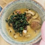 Un très joli carpaccio de noix de Saint Jacques à la truffe, qui apportera une note de fraîcheur tout en délicatesse à votre repas. - Boulettes d’agneau et boeuf au Curry, champignons lait de coco, chou kale à l’ail et sésame par Sandra