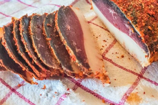 - Plier les tranches de jambon cru en éventail et les disposer entre les triangles de tome.