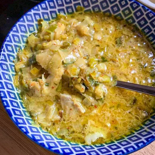 Fabienne nous propose une soupe originale à la morue et aux poireaux, sur une base de lait de coco et relevée d’épices curry. Pas forcément un ‘classique’ des périodes de Fêtes mais à tester absolument !